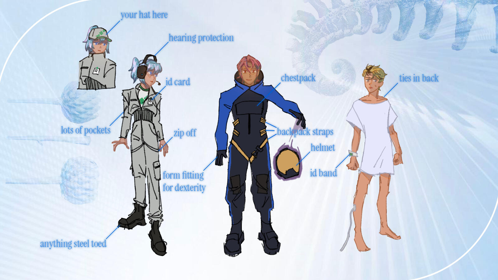 Pictured below (left to right): ONBOARD COVERALL, EXPLORATION SUIT, CRYOGOWN (options available for those who prefer more coverage).Onboard coveralls are only required while on the clock and may be customized within reason. While working, hair that reaches below the shoulder should be tied up. If applicable to the task, eye protection should be worn.Off shift, crew may wear casual clothing. Keep in mind, your supervisors and peers will see it.